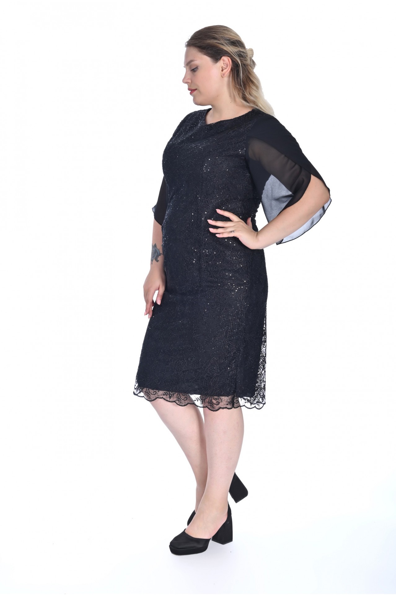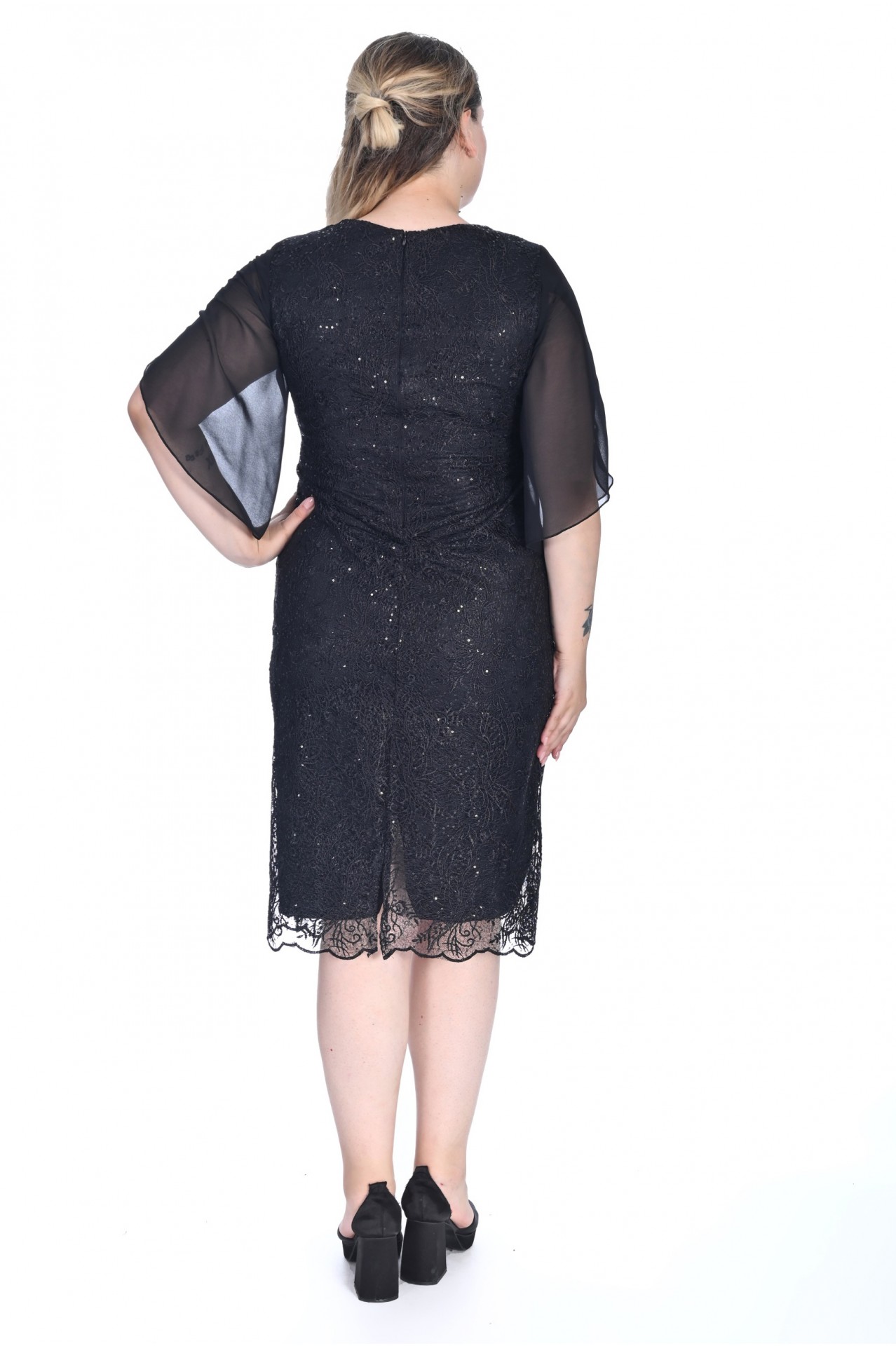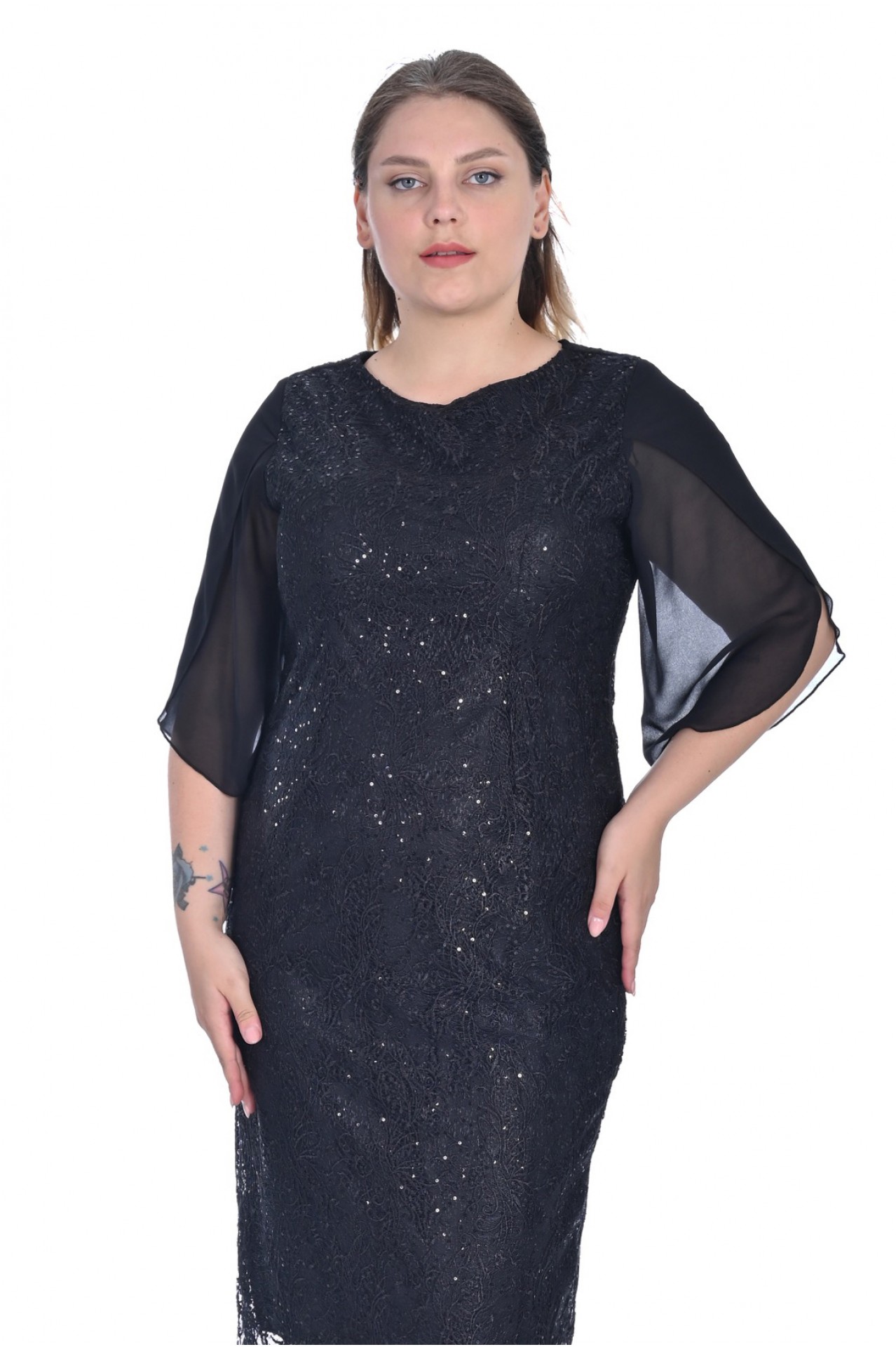 6493 01 Brode Dantel Pullu Kolları Yırtmaçlı Sade Modern Genç Büyük Beden Abiye Elbise - Siyah
