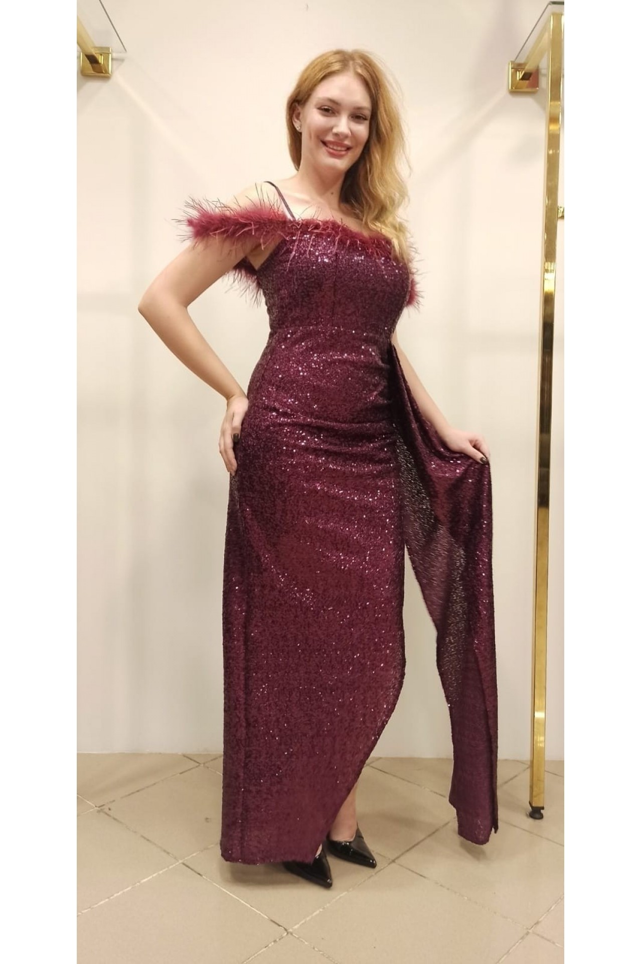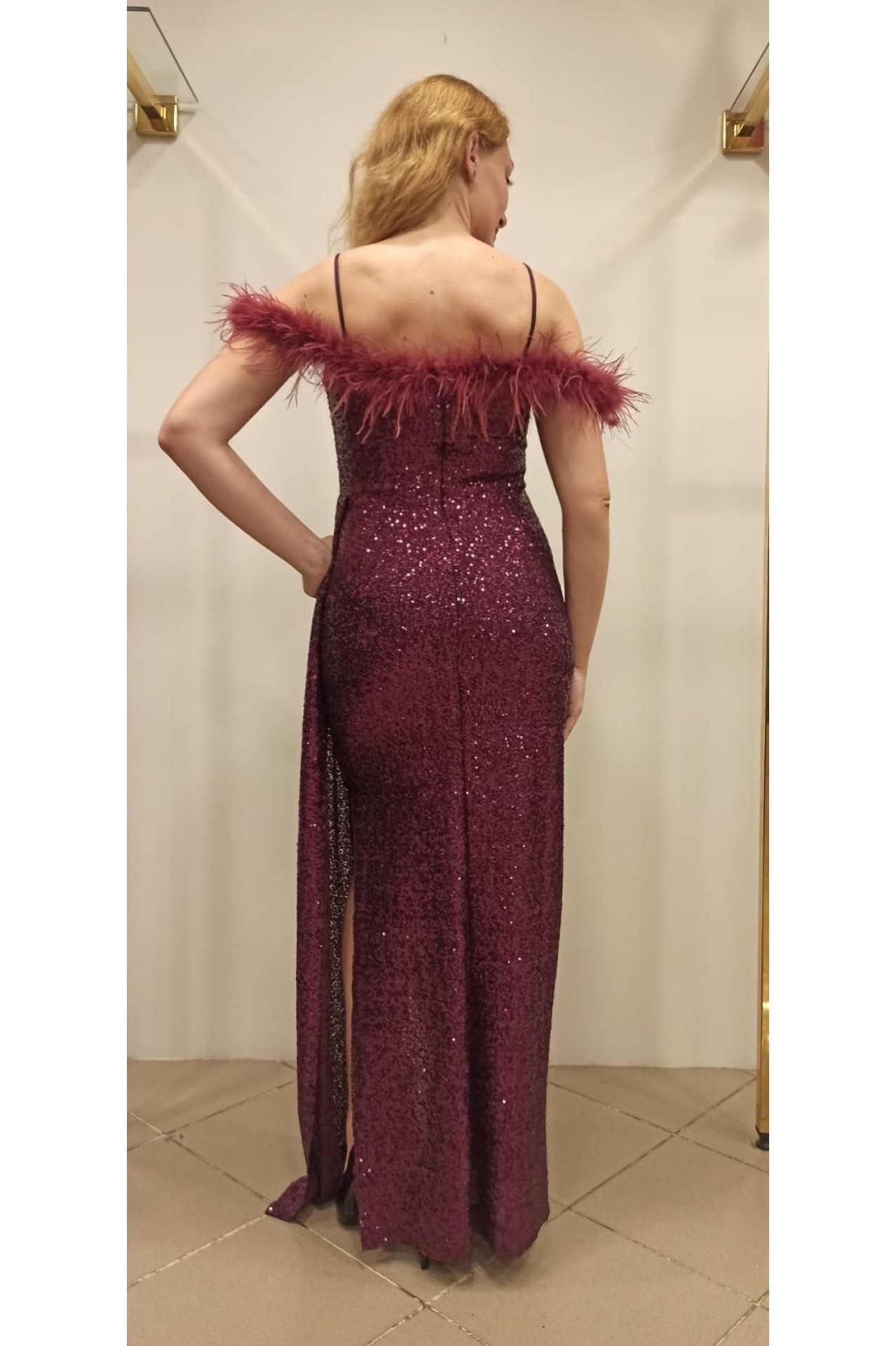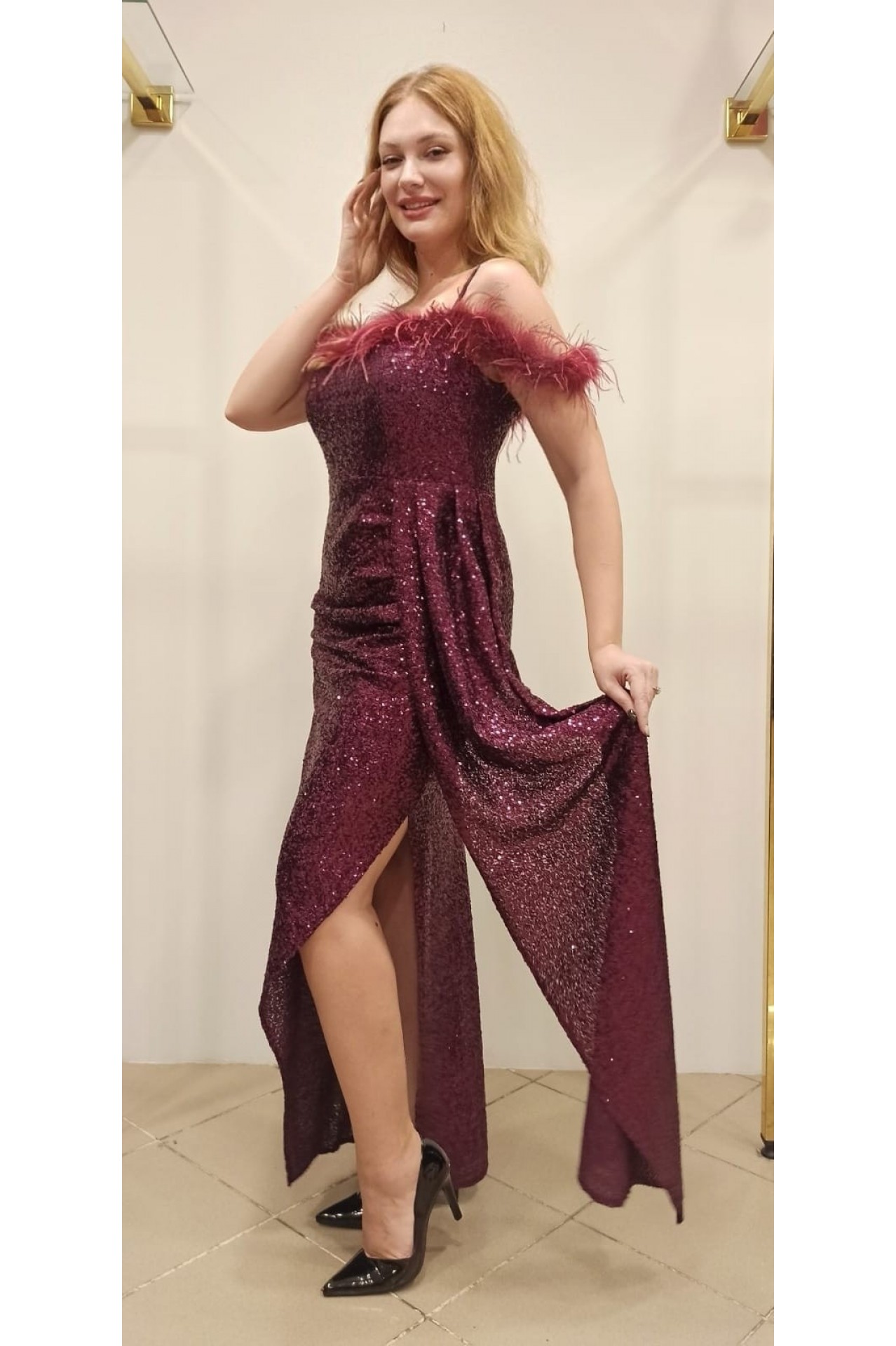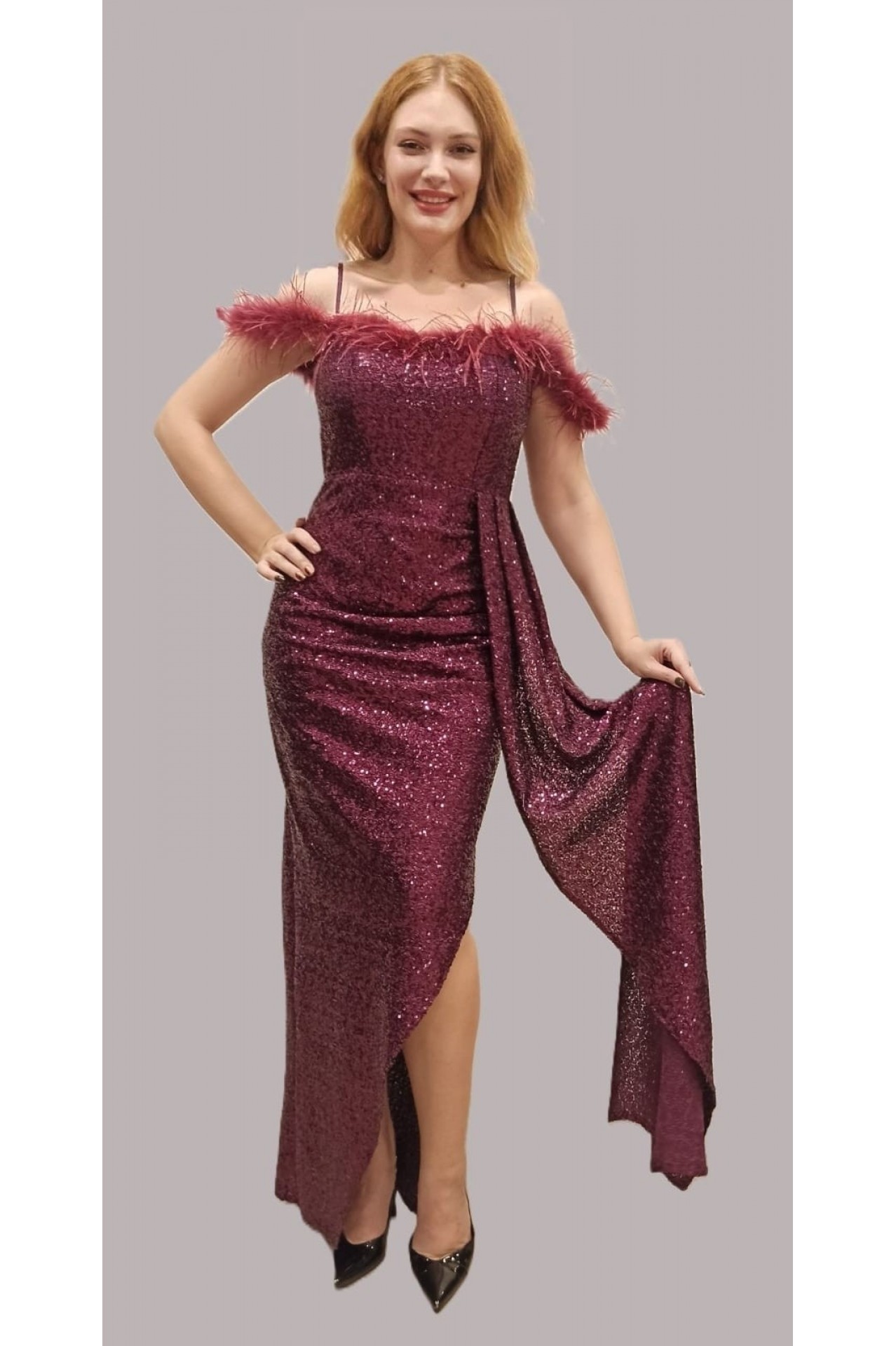 Ürün Özellikleri : Elbisenin kumaşı likralı sık payet örme kumaştan olup bedeninizi sararken, Robadaki malbu tüyleri elbiseye şık bir görünüm katmaktadır. İçi astarlı yandan dekolte yırtmaçlı bir elbisedir