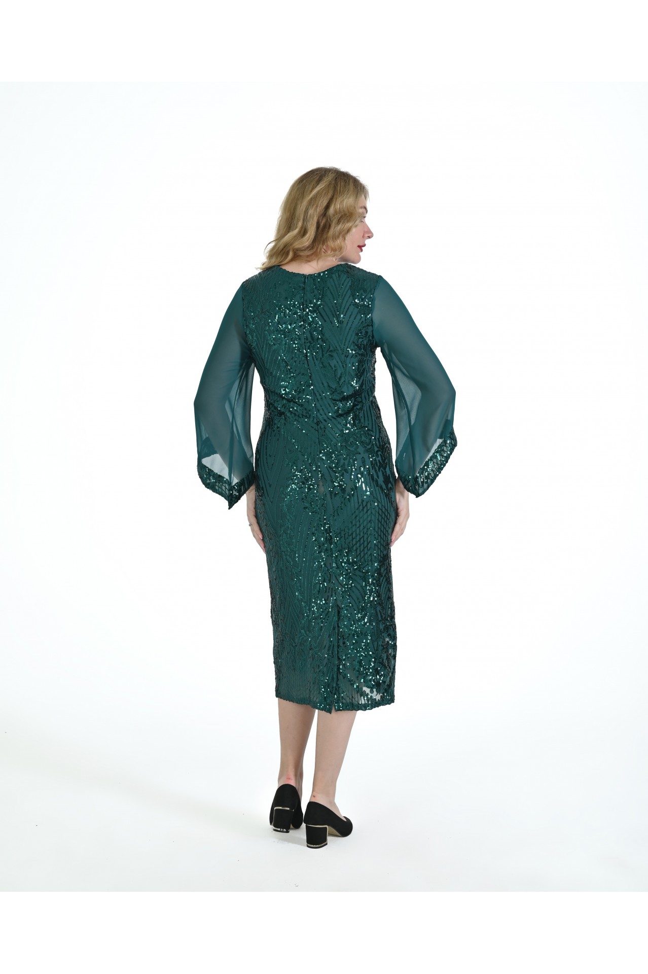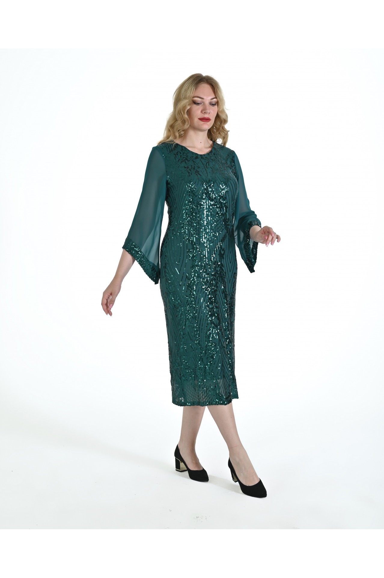 Kısa Pano Desen Payet Kolları Şifon Abiye Elbise - Zümrüt Yeşili